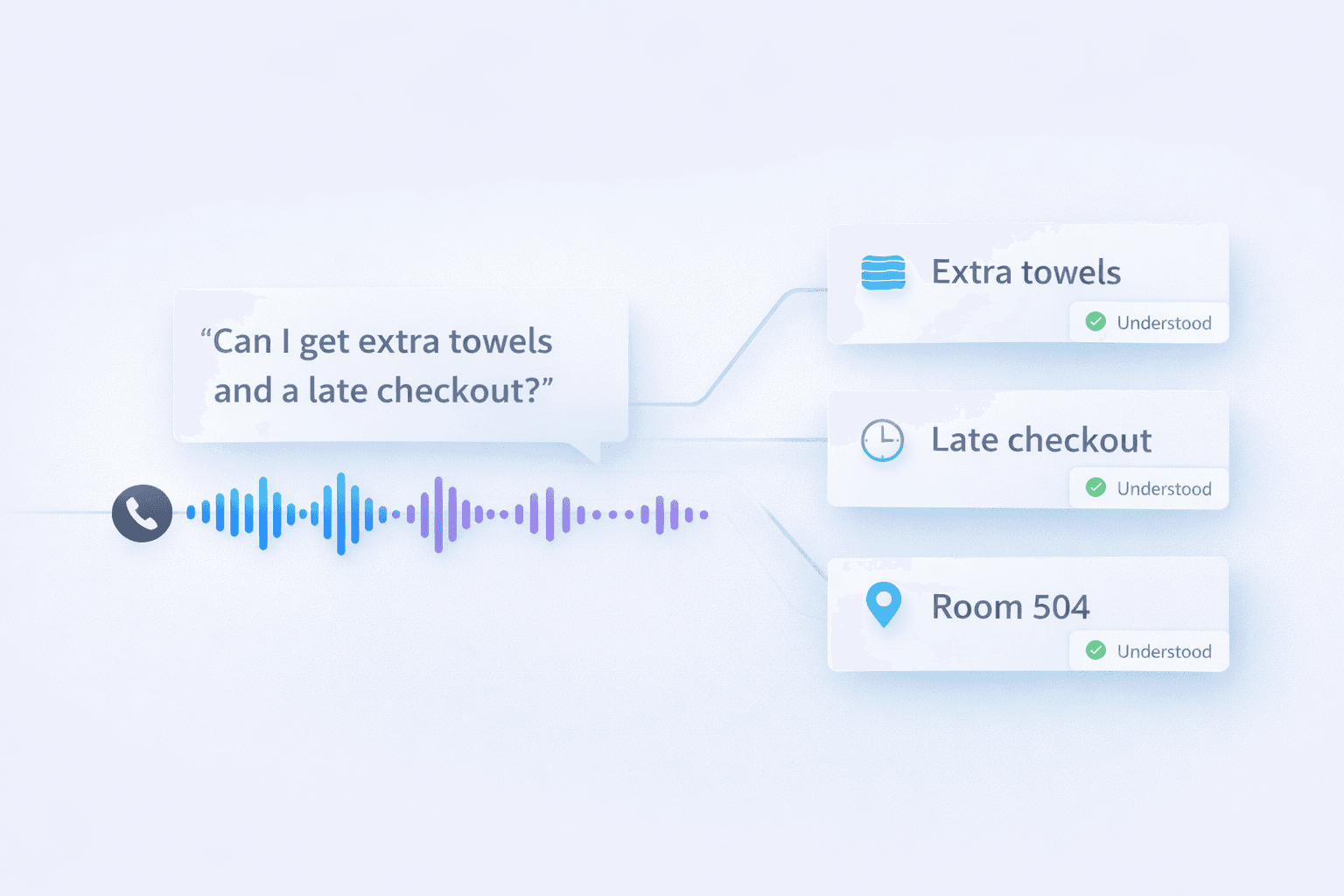 Understands guest intent across dining orders, service bookings, and general hotel questions.