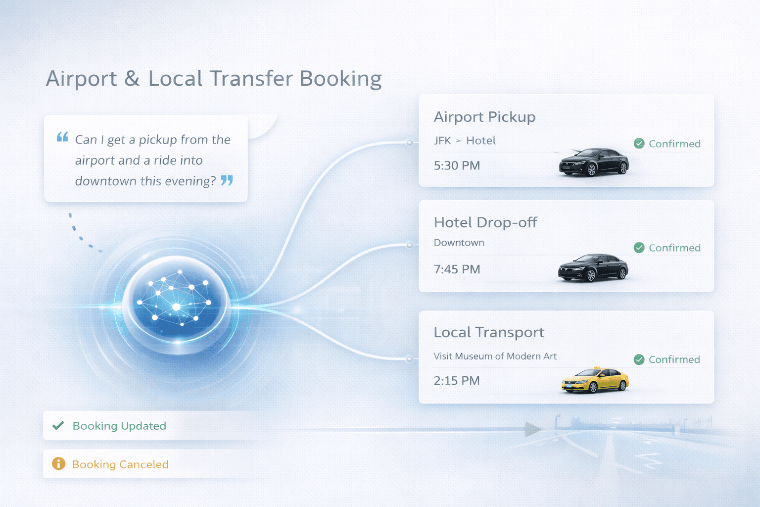 Books airport pickups, drop-offs, and local transport directly through natural guest conversations.